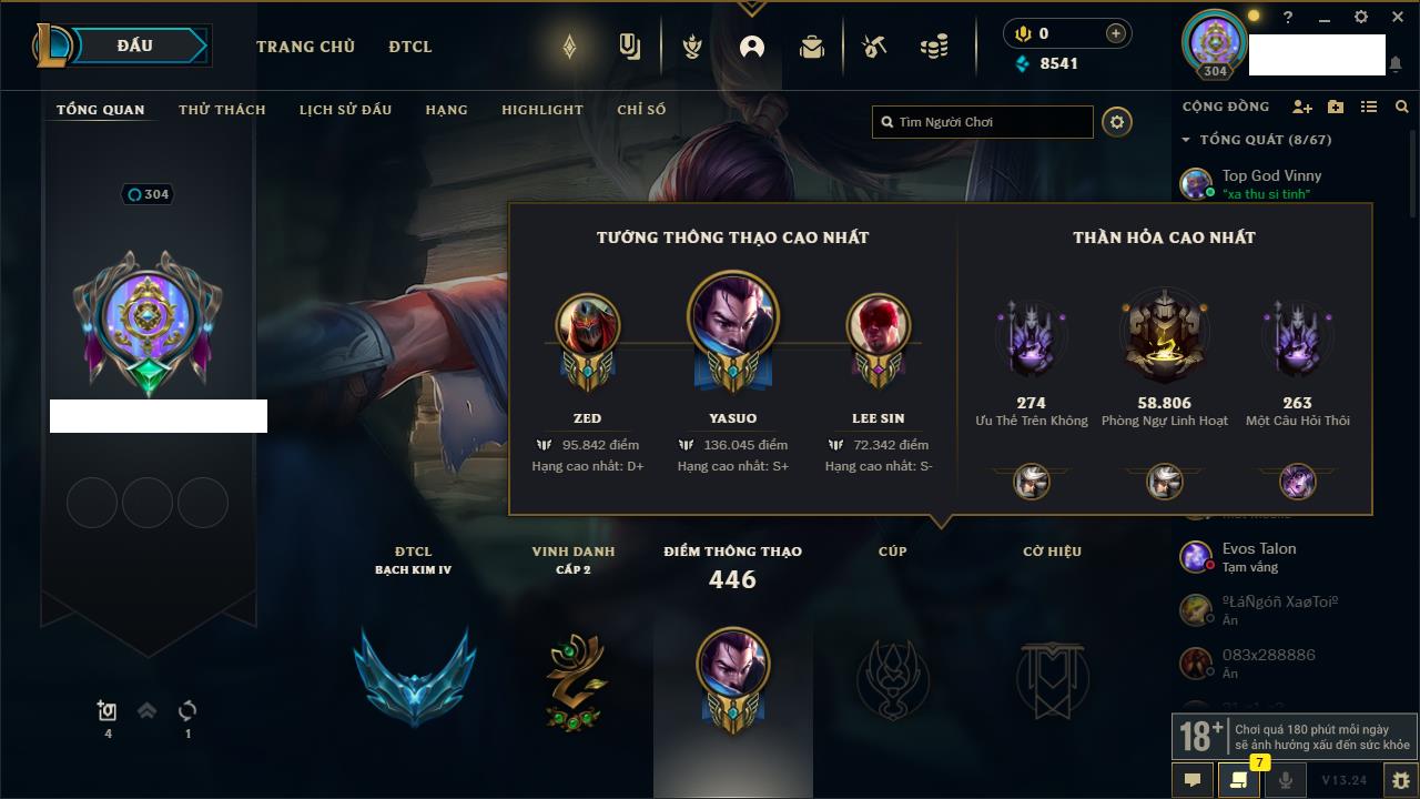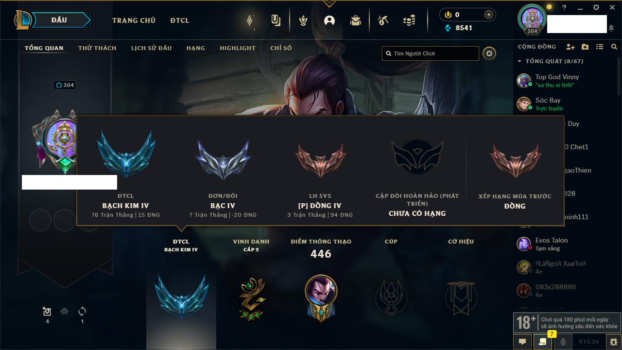 Rank Đơn: Bạch Kim IVKhung: Bạch kimTướng: 151 - Còn 16486 THXTrang Phục: 62Rank ĐTCL: Chưa RankLinh Thú: 12
