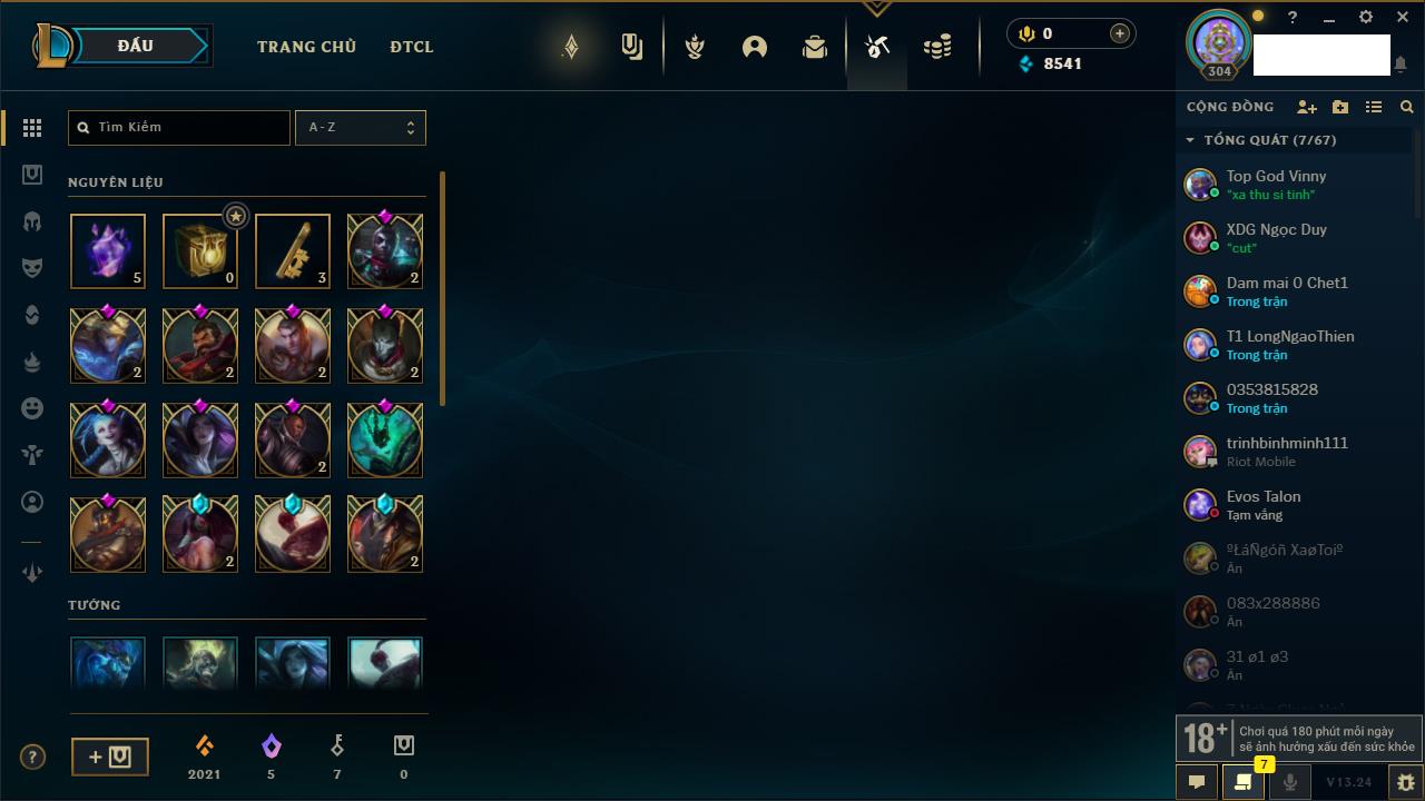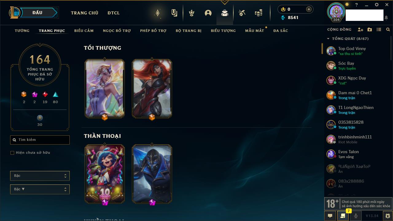 Rank Đơn: Vàng IKhung: VàngTướng: 155 - Còn 18217 THXTrang Phục: 63Rank ĐTCL: Chưa RankLinh Thú: 49