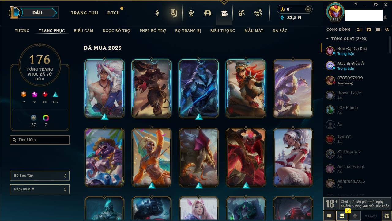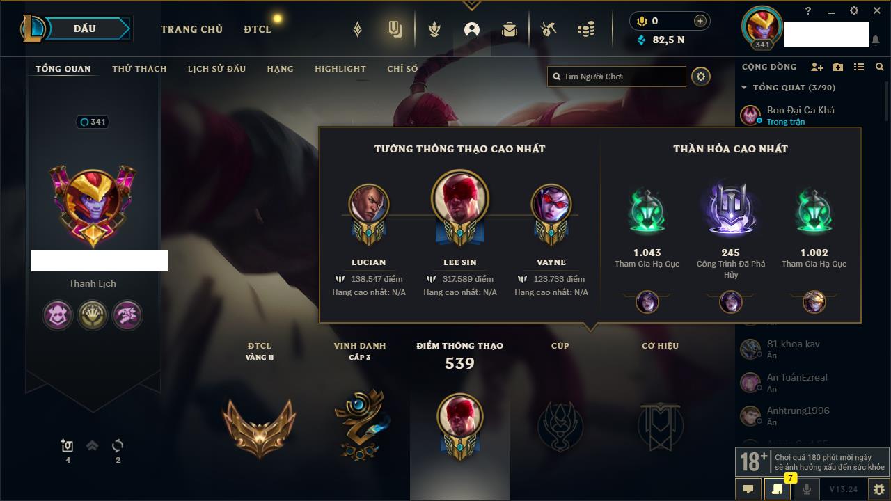 Rank Đơn: Chưa RankKhung: Chưa có khungTướng: 163 - Còn 82582 THXTrang Phục: 176Rank ĐTCL: Chưa RankLinh Thú: 92