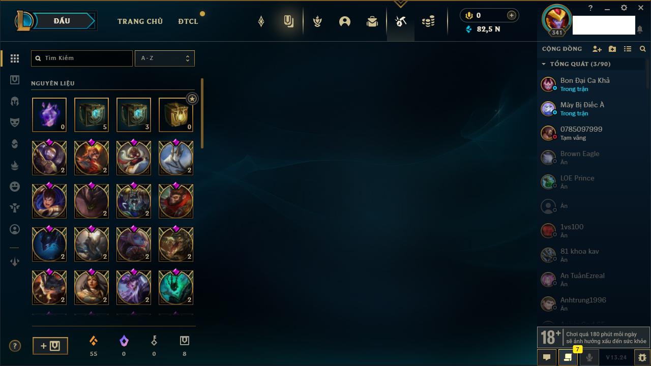 Rank Đơn: Đồng IIKhung: Chưa có khungTướng: 170 - Còn 56487 THXTrang Phục: 90Rank ĐTCL: Chưa RankLinh Thú: 129
