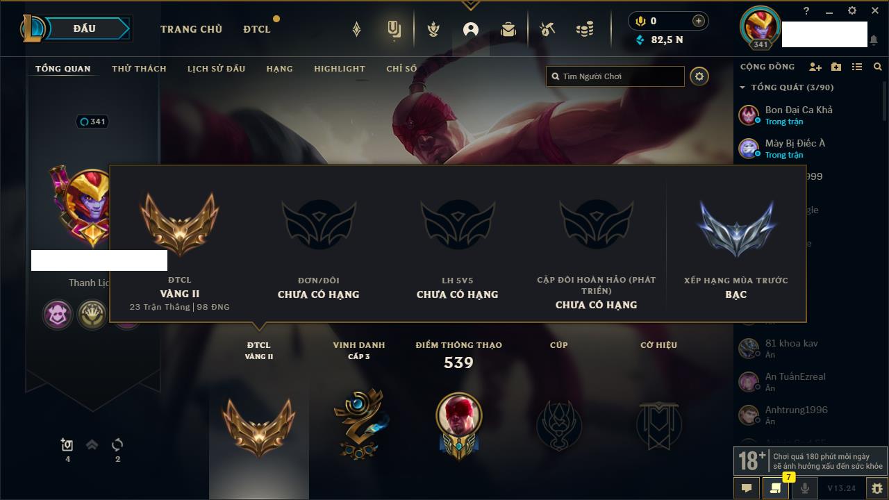 Rank Đơn: Vàng IVKhung: VàngTướng: 146 - Còn 89110 THXTrang Phục: 63Rank ĐTCL: Vàng IIILinh Thú: 41