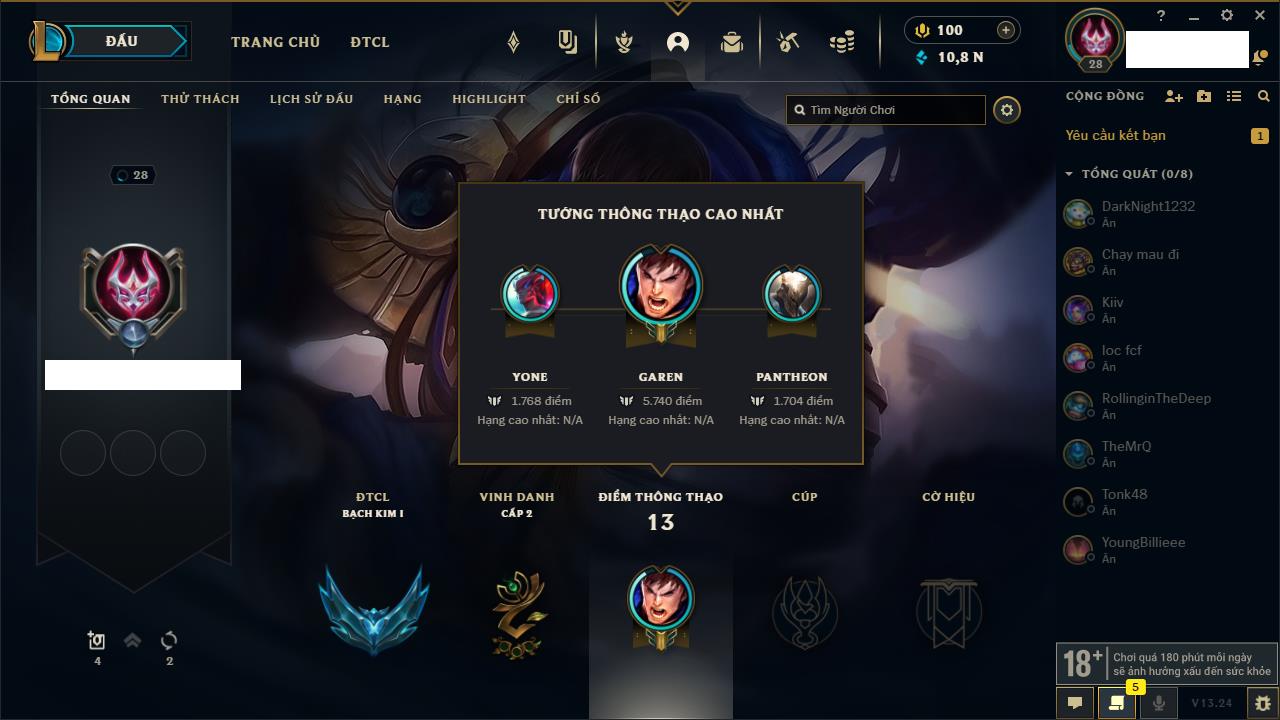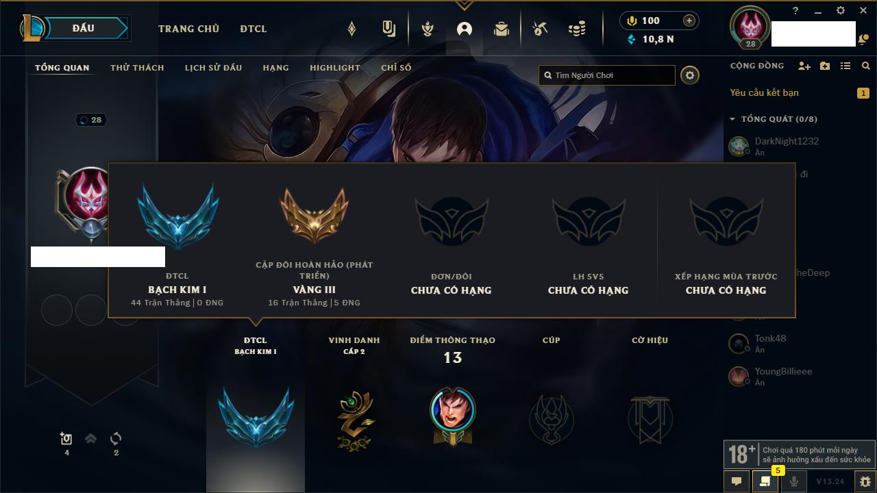 Rank Đơn: Chưa rank mùa nàoKhung: Chưa có khungTướng: 12 - Còn 3853 THXTrang Phục: 2Rank ĐTCL: Chưa RankLinh Thú: 30