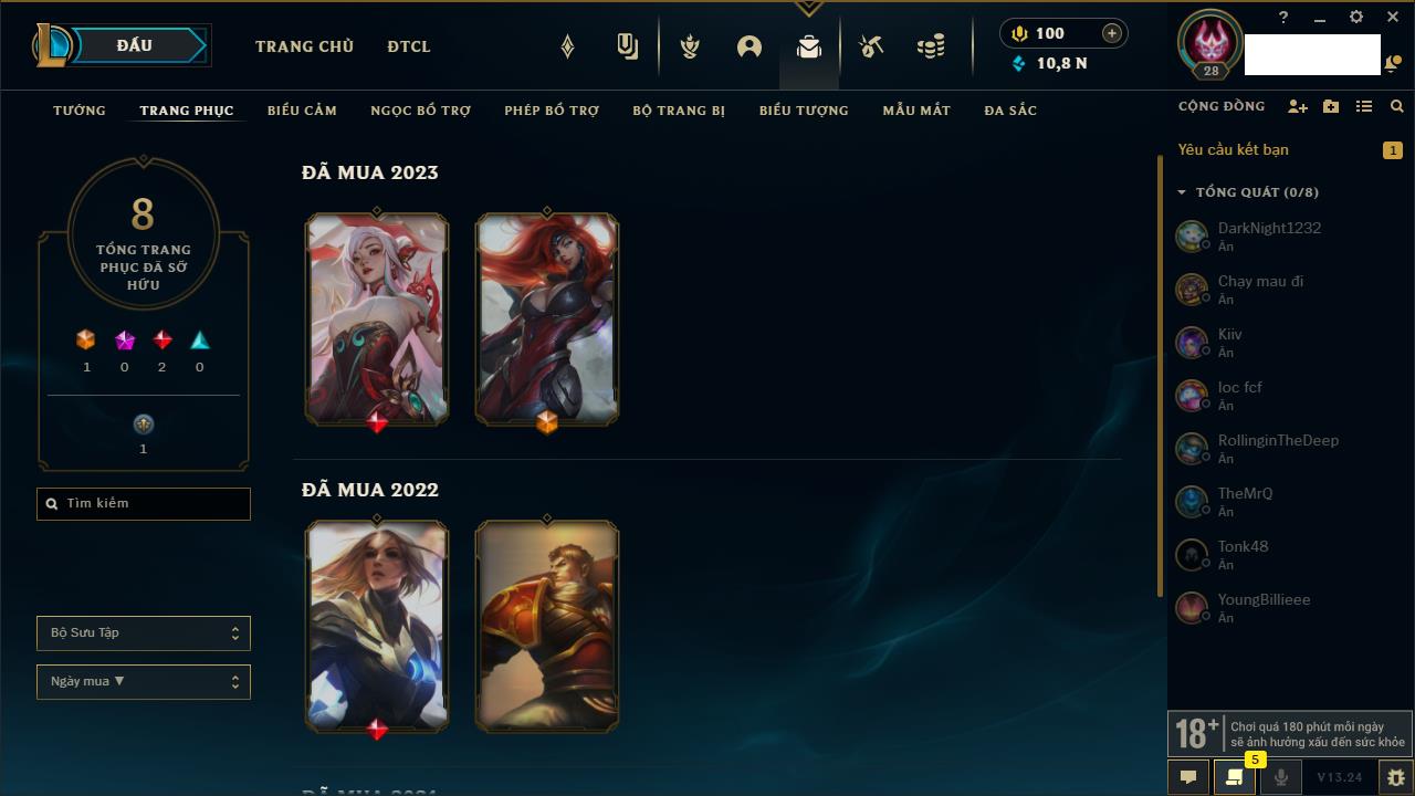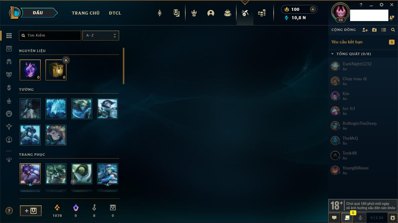 Rank Đơn: Chưa rank mùa nàoKhung: Chưa có khungTướng: 158 - Còn 6970 THXTrang Phục: 32Rank ĐTCL: Chưa RankLinh Thú: 24