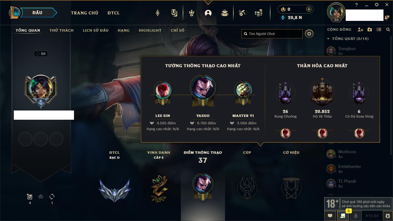 Rank Đơn: Chưa rank mùa nàoKhung: Chưa có khungTướng: 12 - Còn 3853 THXTrang Phục: 2Rank ĐTCL: Chưa RankLinh Thú: 30