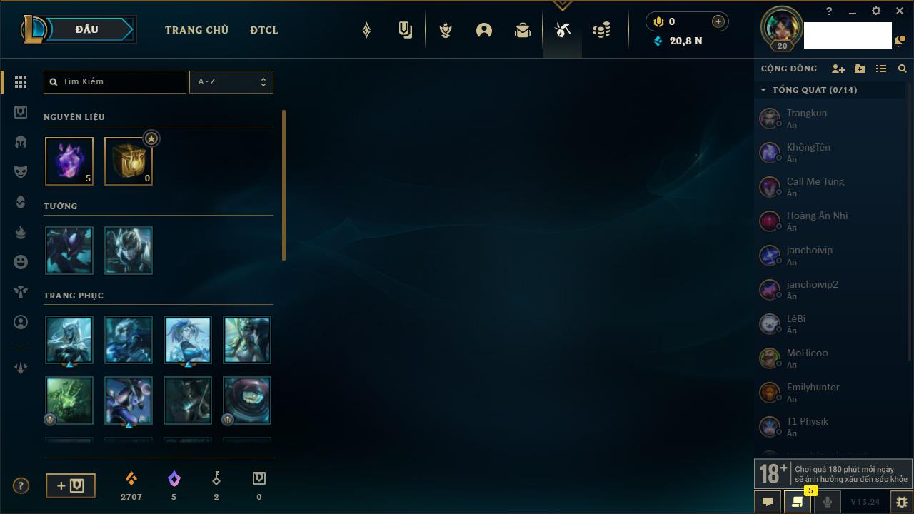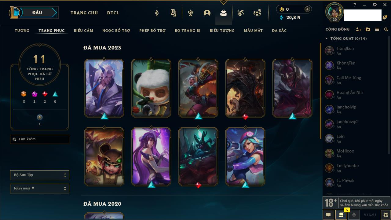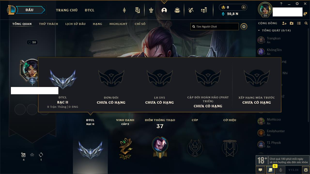 Rank Đơn: Chưa rank mùa nàoKhung: Chưa có khungTướng: 158 - Còn 6970 THXTrang Phục: 32Rank ĐTCL: Chưa RankLinh Thú: 24