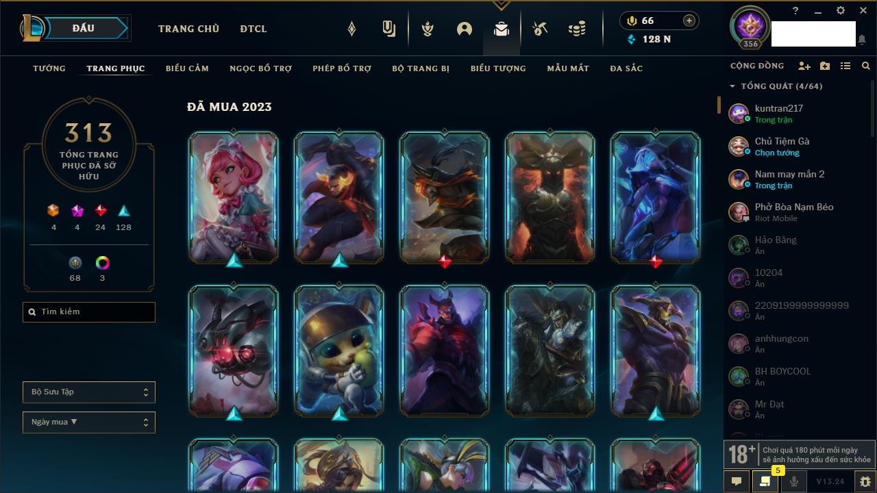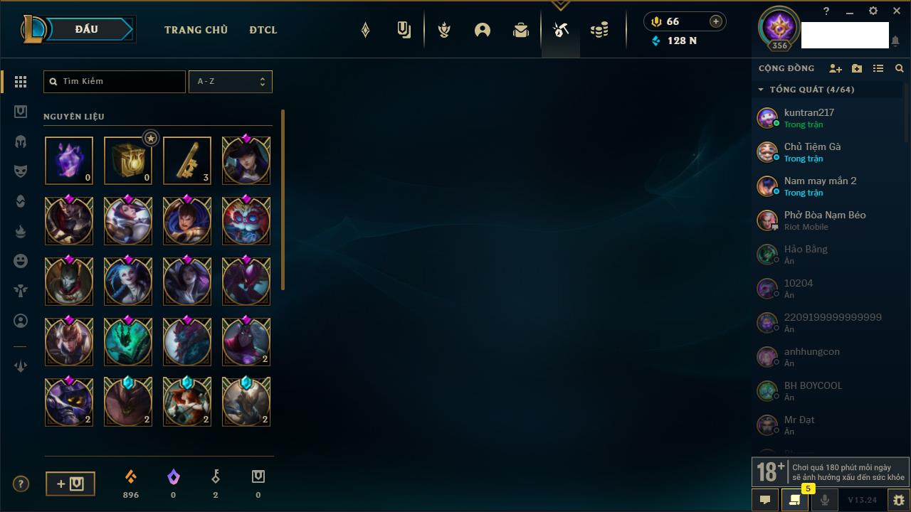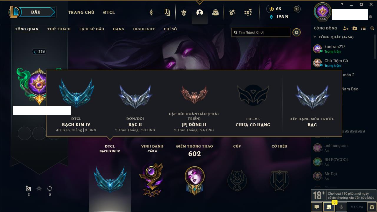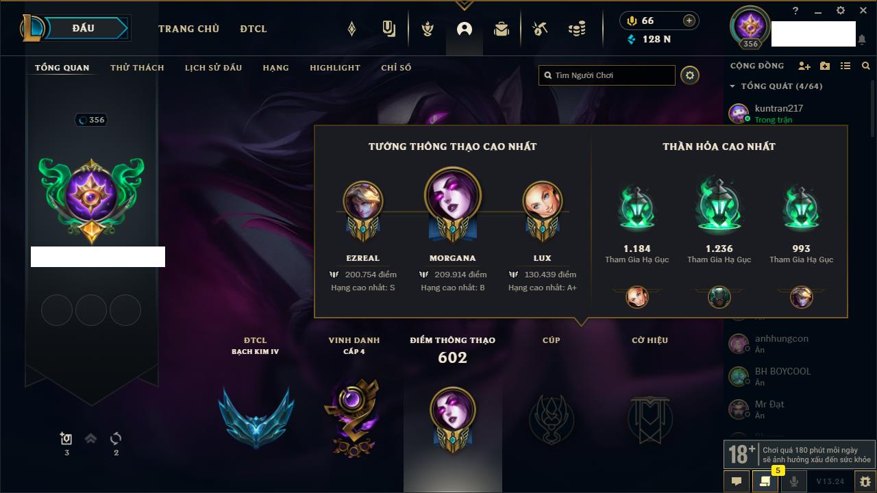 Rank Đơn: Bạch Kim IIIKhung: Bạch kimTướng: 170 - Còn 66107 THXTrang Phục: 201Rank ĐTCL: Chưa RankLinh Thú: 83
