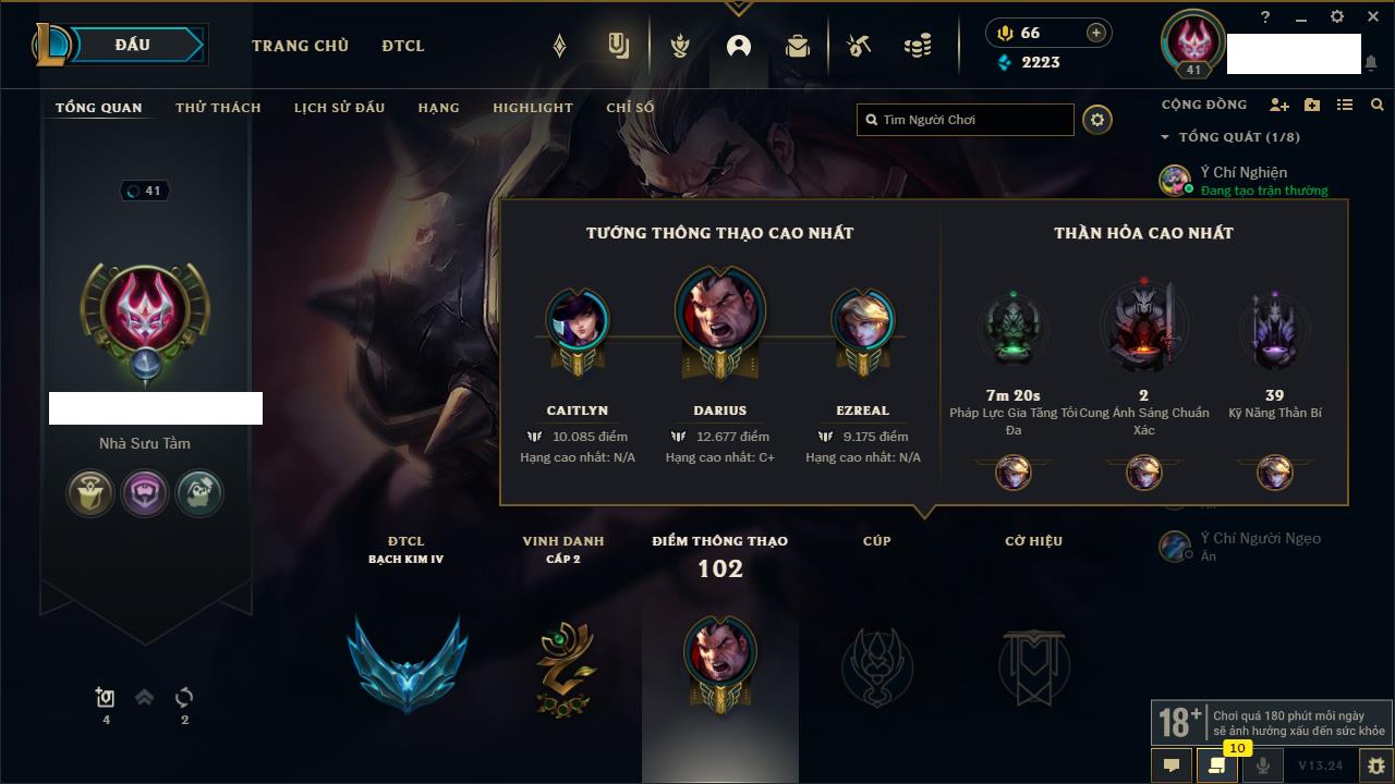 Rank Đơn: Chưa rank mùa nàoKhung: Chưa có khungTướng: 12 - Còn 3853 THXTrang Phục: 2Rank ĐTCL: Chưa RankLinh Thú: 30