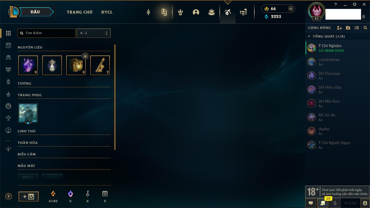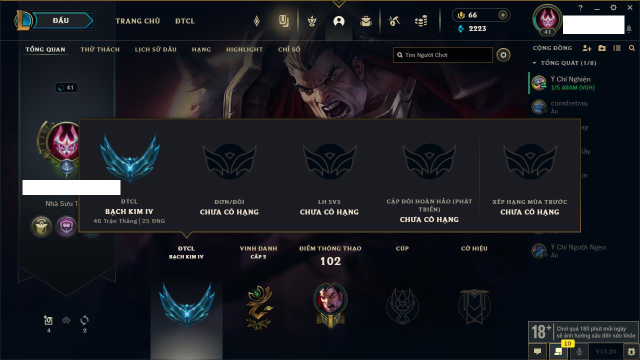 Rank Đơn: Chưa rank mùa nàoKhung: Chưa có khungTướng: 158 - Còn 6970 THXTrang Phục: 32Rank ĐTCL: Chưa RankLinh Thú: 24