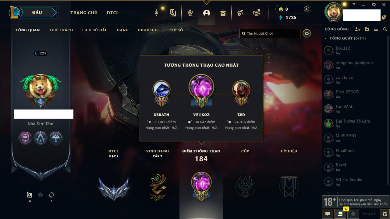 Rank Đơn: Chưa rank mùa nàoKhung: Chưa có khungTướng: 12 - Còn 3853 THXTrang Phục: 2Rank ĐTCL: Chưa RankLinh Thú: 30