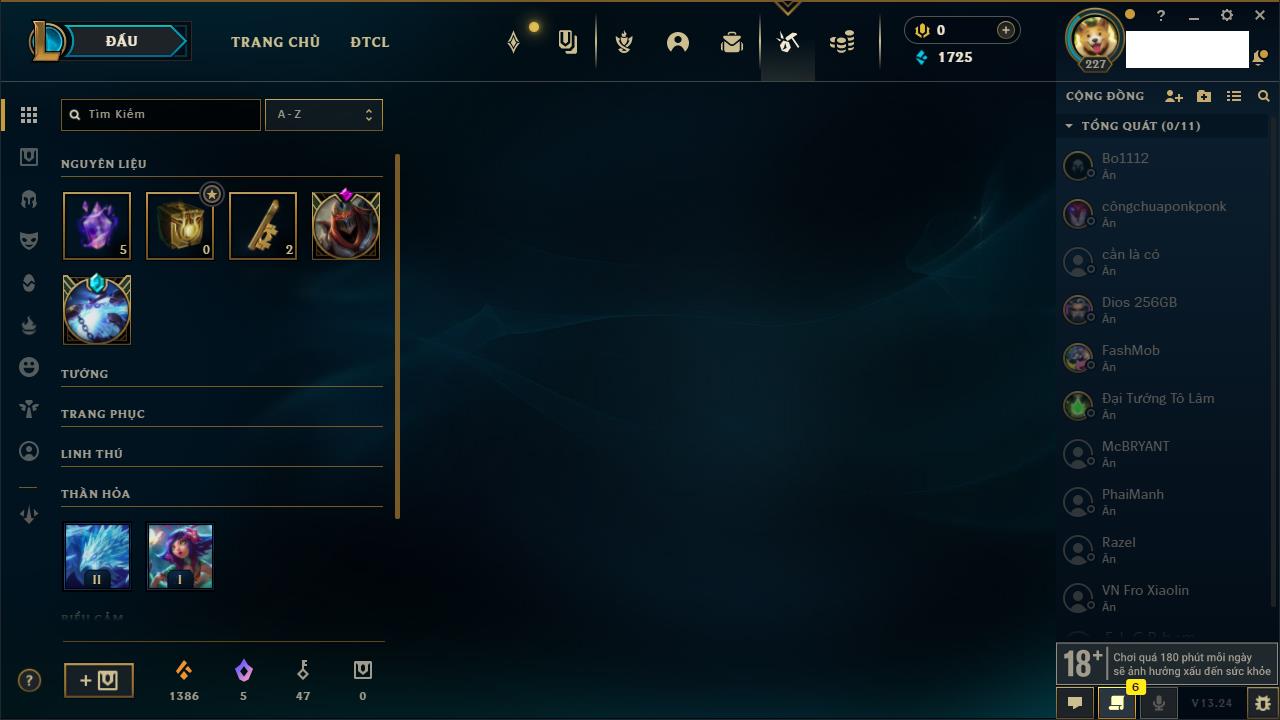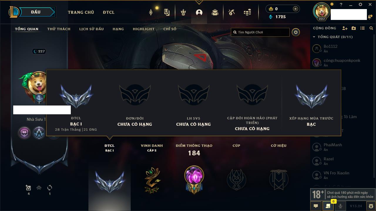 Rank Đơn: Vàng IIIKhung: VàngTướng: 77 - Còn 21172 THXTrang Phục: 8Rank ĐTCL: Kim Cương IIILinh Thú: 23