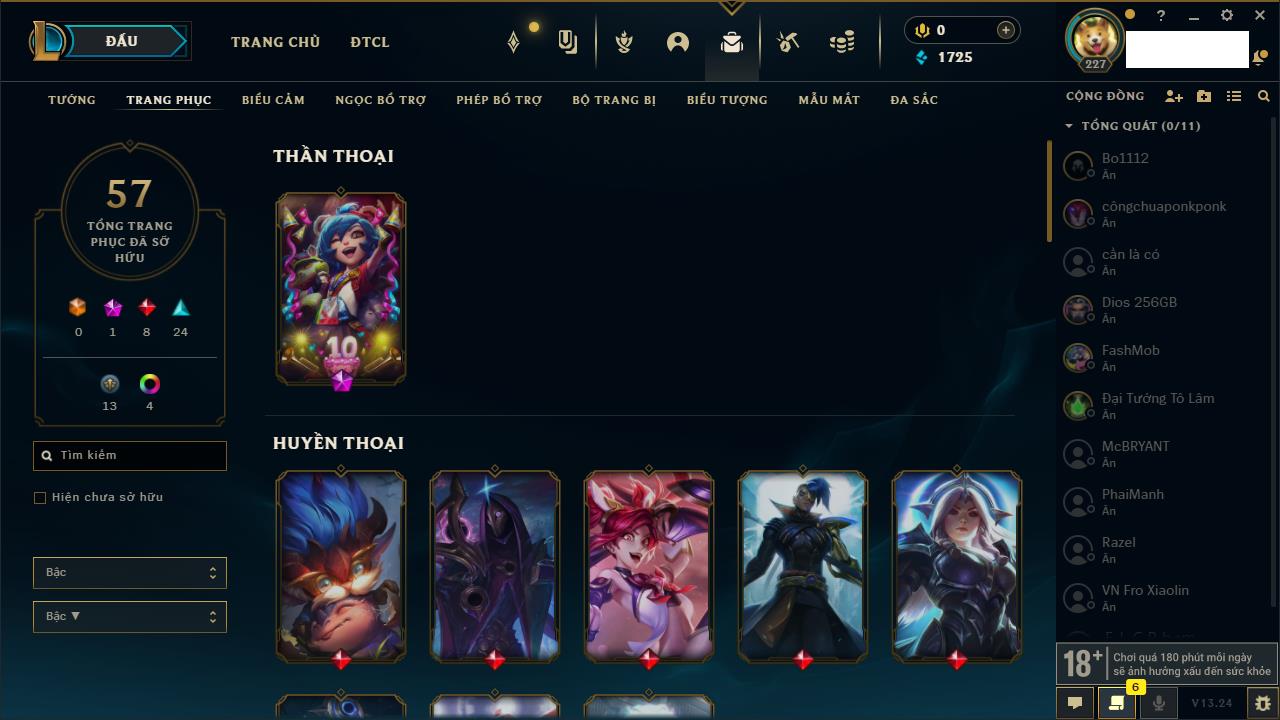 Rank Đơn: Chưa rank mùa nàoKhung: Chưa có khungTướng: 108 - Còn 6515 THXTrang Phục: 23Rank ĐTCL: Chưa RankLinh Thú: 111
