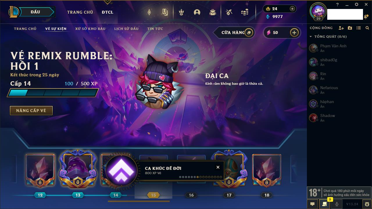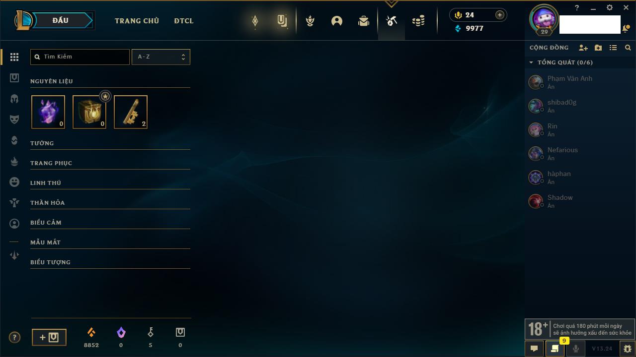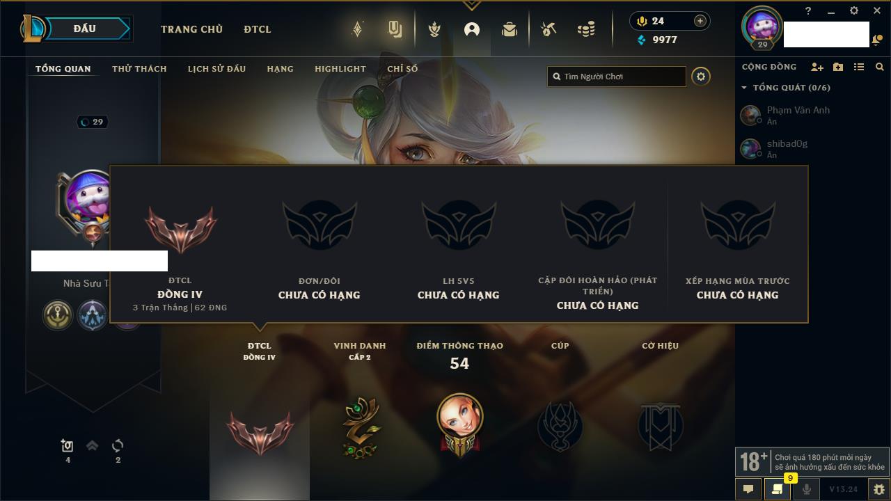 Rank Đơn: Chưa RankKhung: Chưa có khungTướng: 27 - Còn 170 THXTrang Phục: 0Rank ĐTCL: Chưa RankLinh Thú: 33