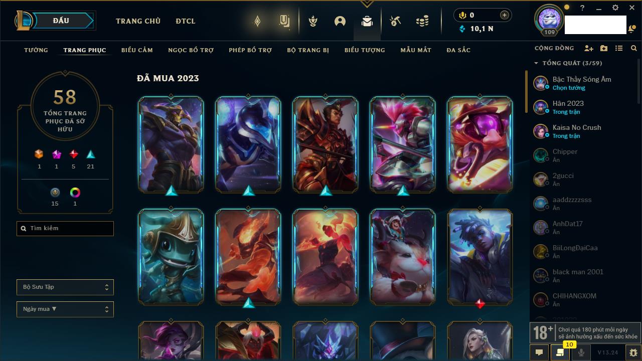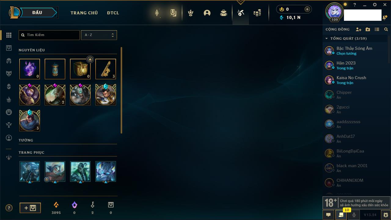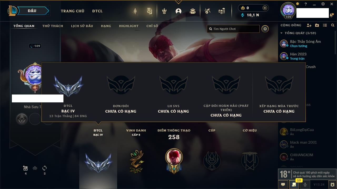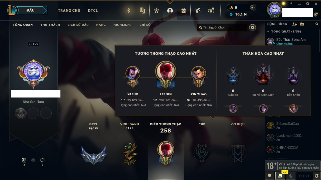 Rank Đơn: Sắt IIIKhung: Chưa có khungTướng: 77 - Còn 8133 THXTrang Phục: 11Rank ĐTCL: Bạch Kim IVLinh Thú: 108