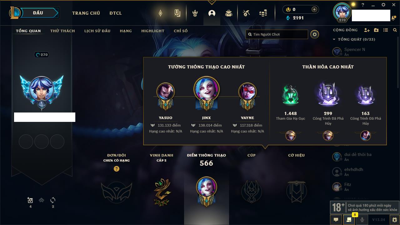 Rank Đơn: Chưa RankKhung: Chưa có khungTướng: 161 - Còn 144228 THXTrang Phục: 179Rank ĐTCL: Chưa RankLinh Thú: 12