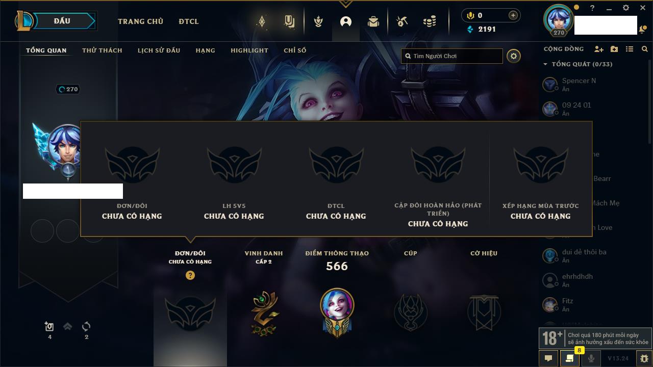 Rank Đơn: Chưa RankKhung: Chưa có khungTướng: 65 - Còn 2075 THXTrang Phục: 10Rank ĐTCL: Chưa RankLinh Thú: 72