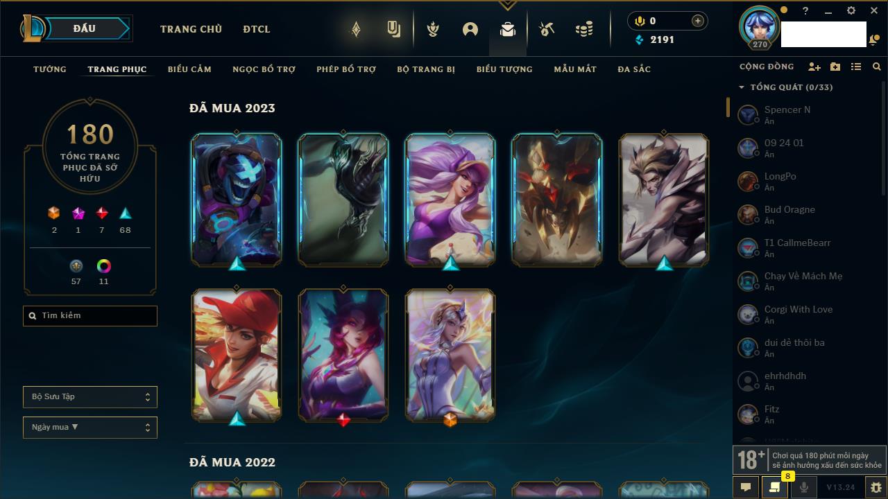 Rank Đơn: Chưa RankKhung: Chưa có khungTướng: 138 - Còn 8469 THXTrang Phục: 82Rank ĐTCL: Chưa RankLinh Thú: 51