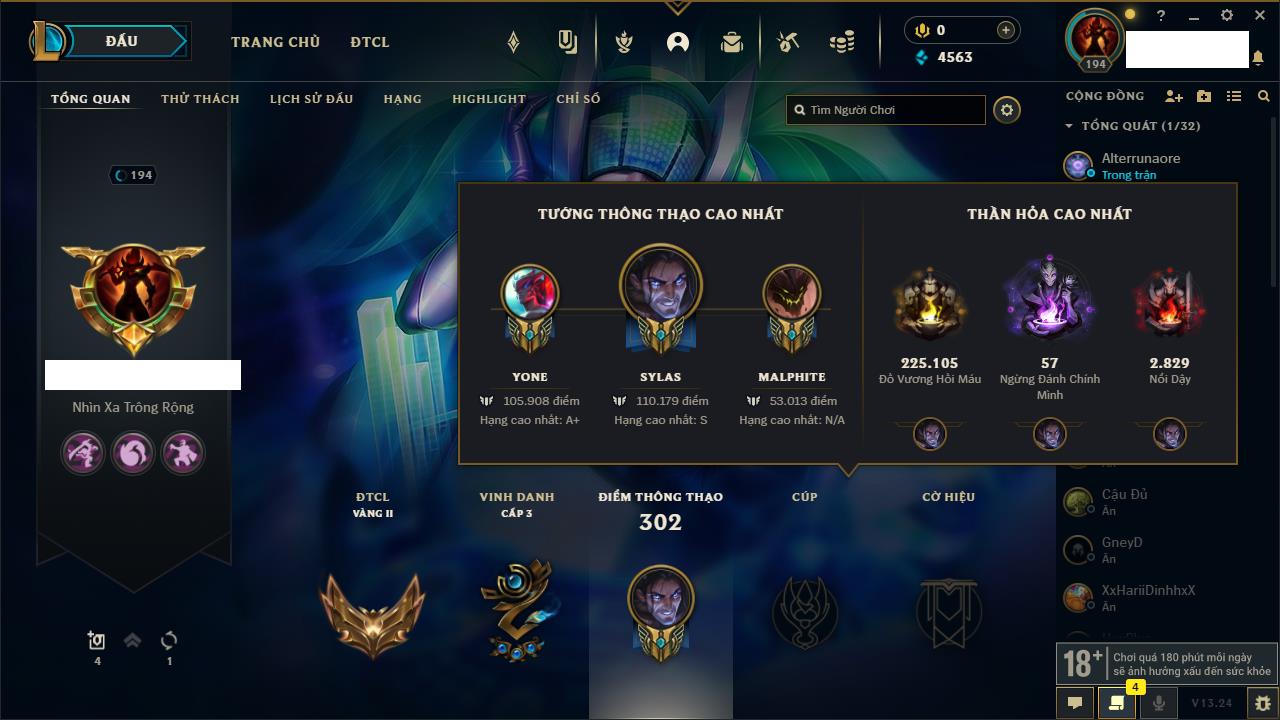 Rank Đơn: Sắt IIIKhung: Chưa có khungTướng: 167 - Còn 8283 THXTrang Phục: 107Rank ĐTCL: Chưa RankLinh Thú: 64