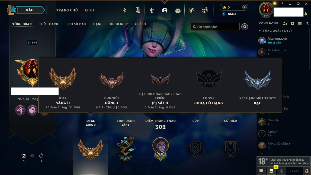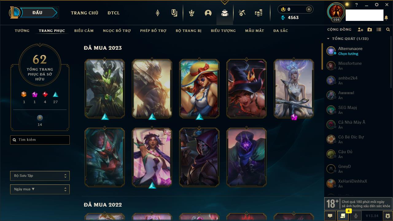 Rank Đơn: Bạc IVKhung: ĐồngTướng: 170 - Còn 54335 THXTrang Phục: 135Rank ĐTCL: Chưa RankLinh Thú: 142