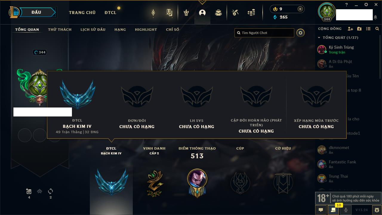 Rank Đơn: Bạc IV Khung: Bạc Tướng: 64 - Còn 5901 THX Trang Phục: 17 Rank ĐTCL: Chưa Rank Linh Thú: 105