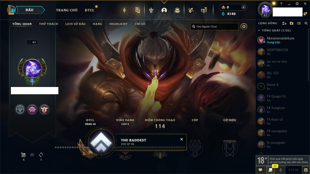 Rank Đơn: Sắt IIIKhung: Chưa có khungTướng: 88 - Còn 1376 THXTrang Phục: 12Rank ĐTCL: Bạc IVLinh Thú: 69