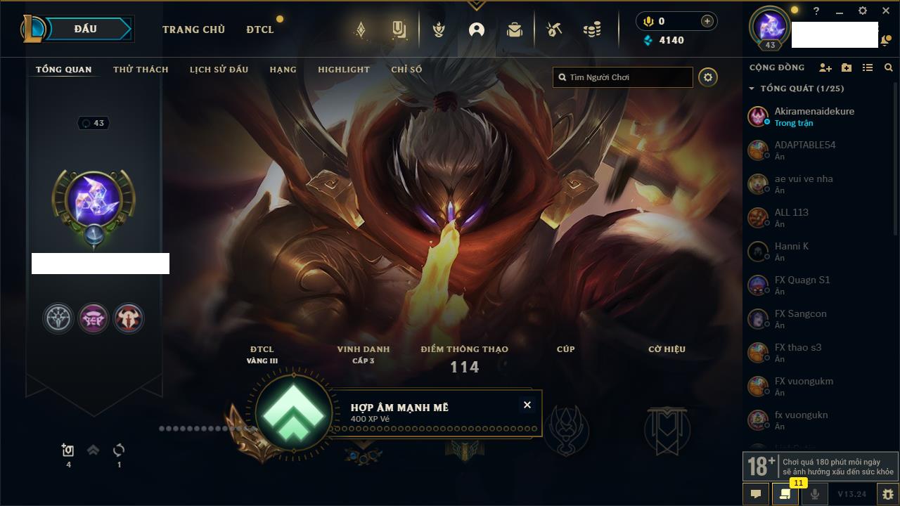 Rank Đơn: Đồng IIIKhung: Chưa có khungTướng: 86 - Còn 14367 THXTrang Phục: 19Rank ĐTCL: Vàng IIILinh Thú: 95
