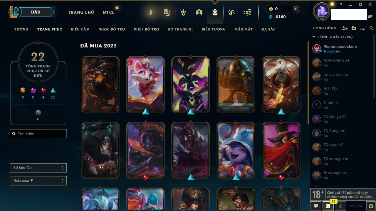 Rank Đơn: Sắt IIIKhung: Chưa có khungTướng: 77 - Còn 8133 THXTrang Phục: 11Rank ĐTCL: Bạch Kim IVLinh Thú: 108