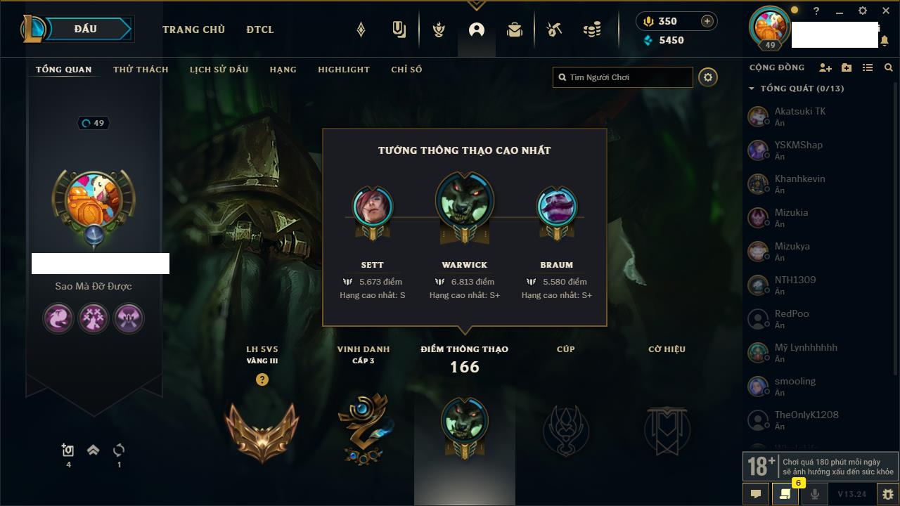 Rank Đơn: Chưa RankKhung: Chưa có khungTướng: 71 - Còn 5588 THXTrang Phục: 28Rank ĐTCL: Chưa RankLinh Thú: 43