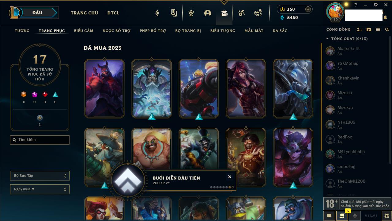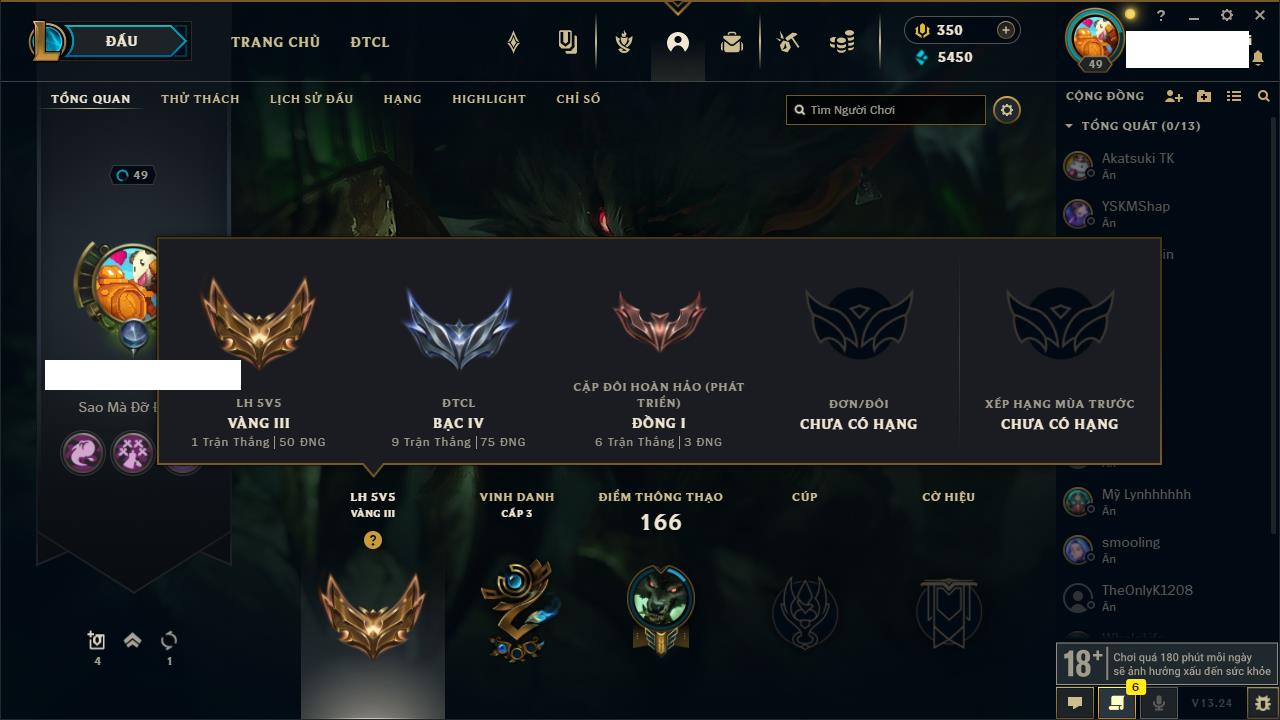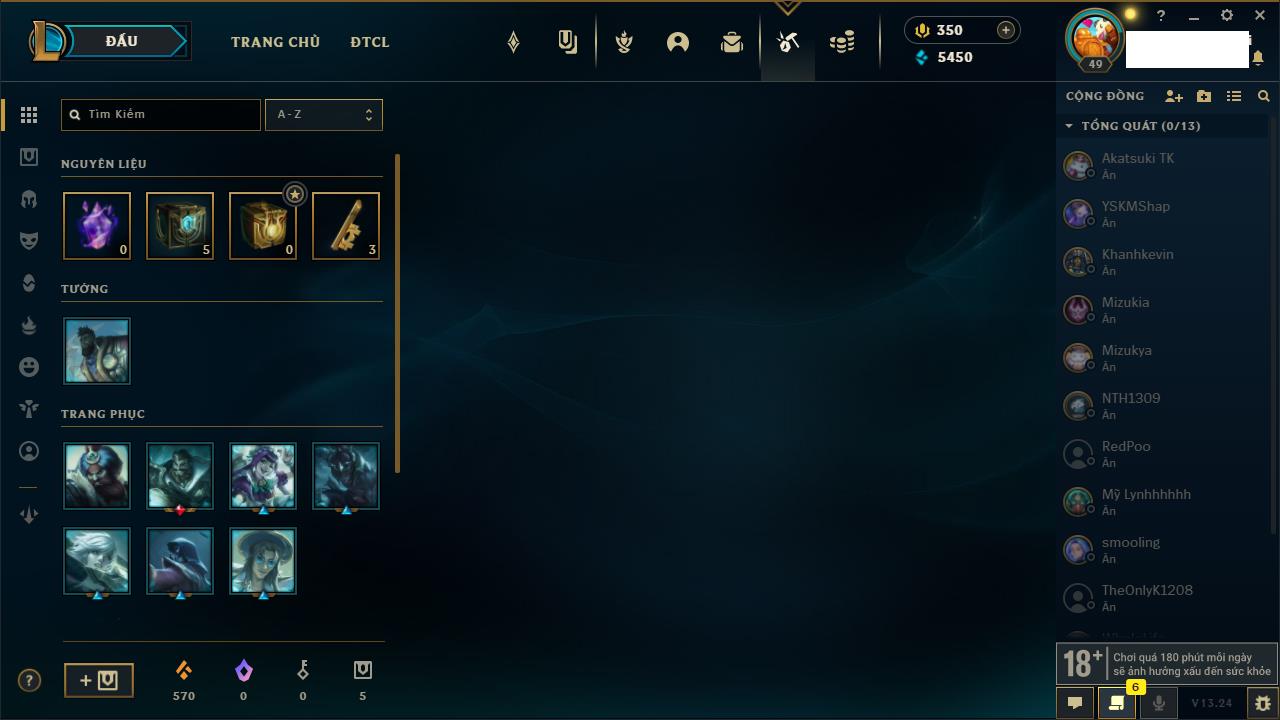 Rank Đơn: Chưa rank mùa nàoKhung: Chưa có khungTướng: 145 - Còn 5450 THXTrang Phục: 17Rank ĐTCL: Chưa RankLinh Thú: 14