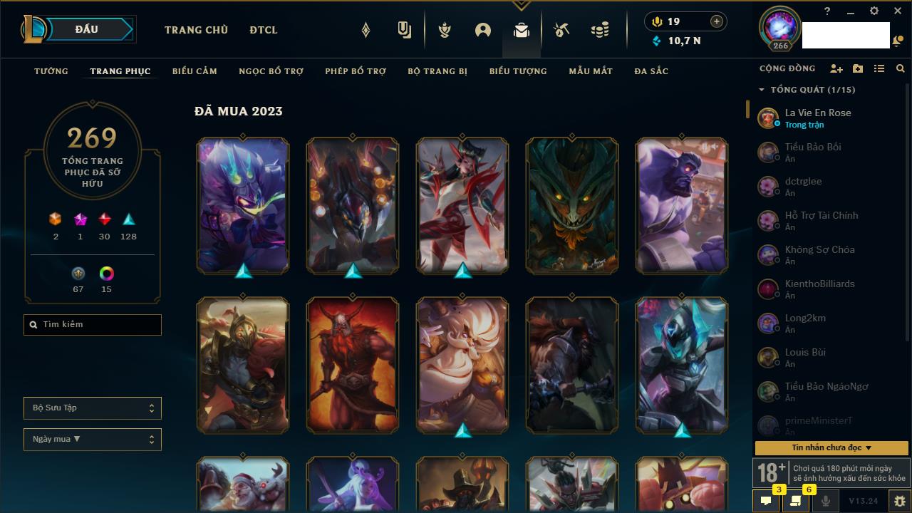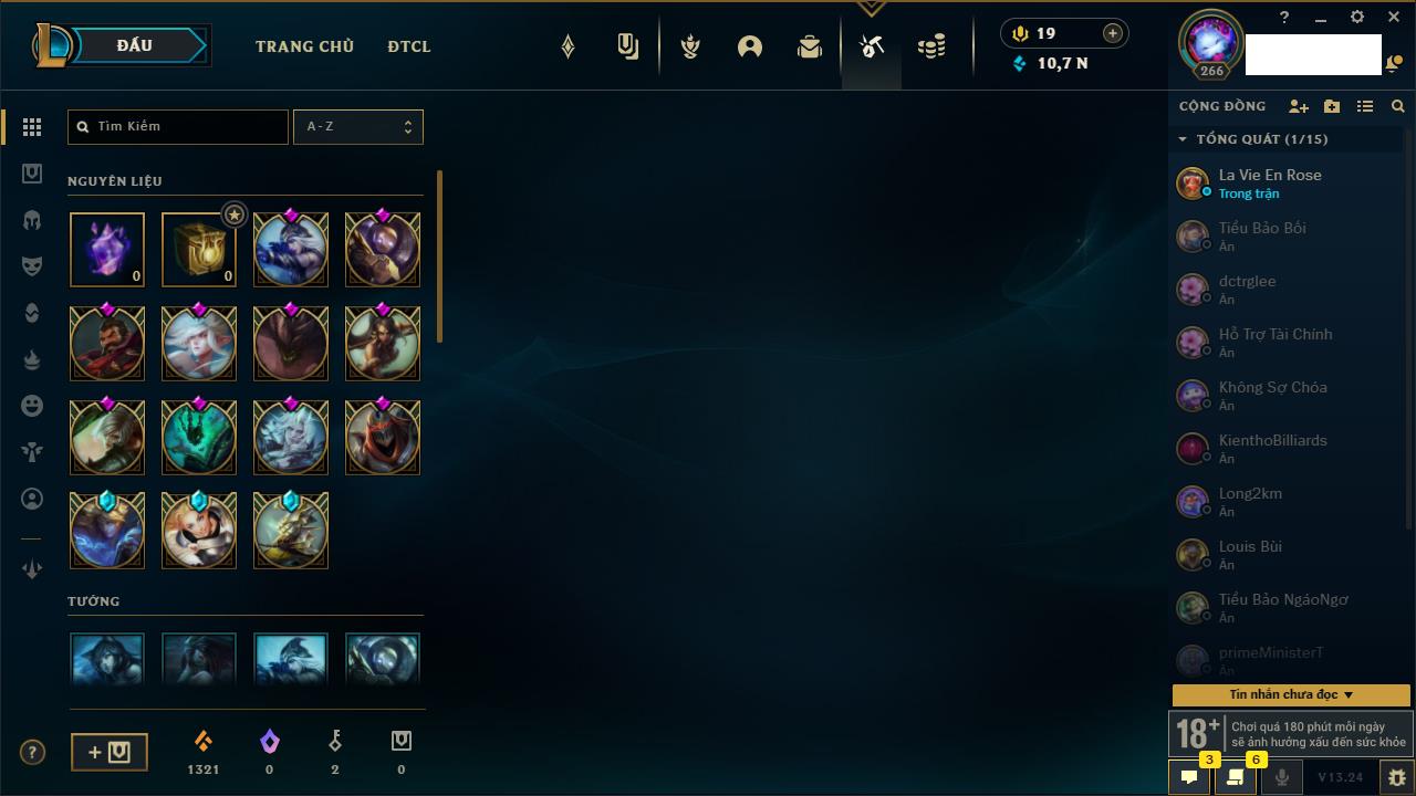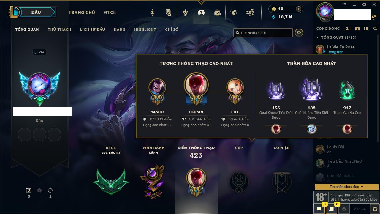 Rank Đơn: Bạch Kim IVKhung: VàngTướng: 171 - Còn 130578 THXTrang Phục: 253Rank ĐTCL: Chưa RankLinh Thú: 20