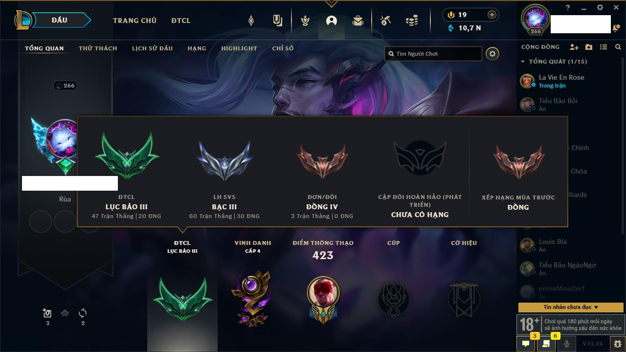 Rank Đơn: Bạc IVKhung: BạcTướng: 171 - Còn 173918 THXTrang Phục: 233Rank ĐTCL: Lục Bảo IIILinh Thú: 26
