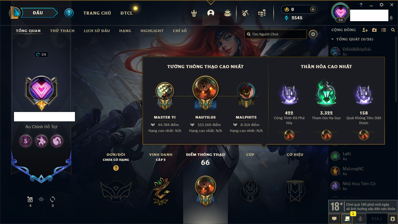 Rank Đơn: Sắt IIIKhung: Chưa có khungTướng: 88 - Còn 1376 THXTrang Phục: 12Rank ĐTCL: Bạc IVLinh Thú: 69