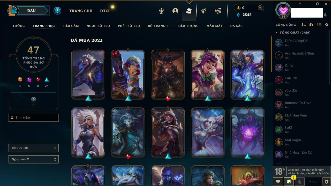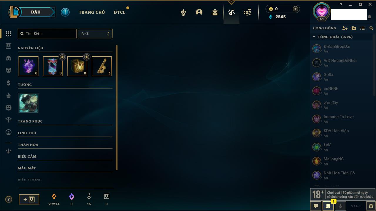 Rank Đơn: Sắt IIIKhung: Chưa có khungTướng: 77 - Còn 8133 THXTrang Phục: 11Rank ĐTCL: Bạch Kim IVLinh Thú: 108