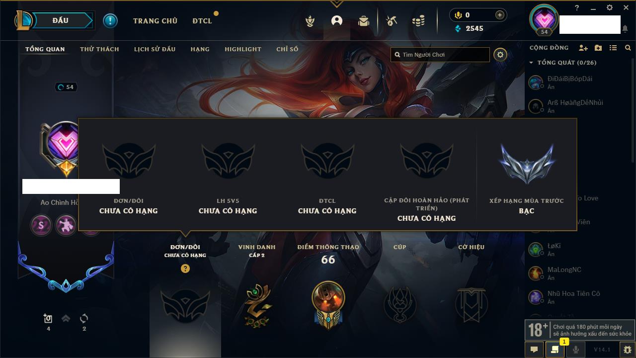 Rank Đơn: Bạc IVKhung: BạcTướng: 76 - Còn 1316 THXTrang Phục: 14Rank ĐTCL: Vàng IILinh Thú: 96