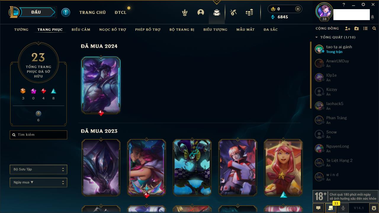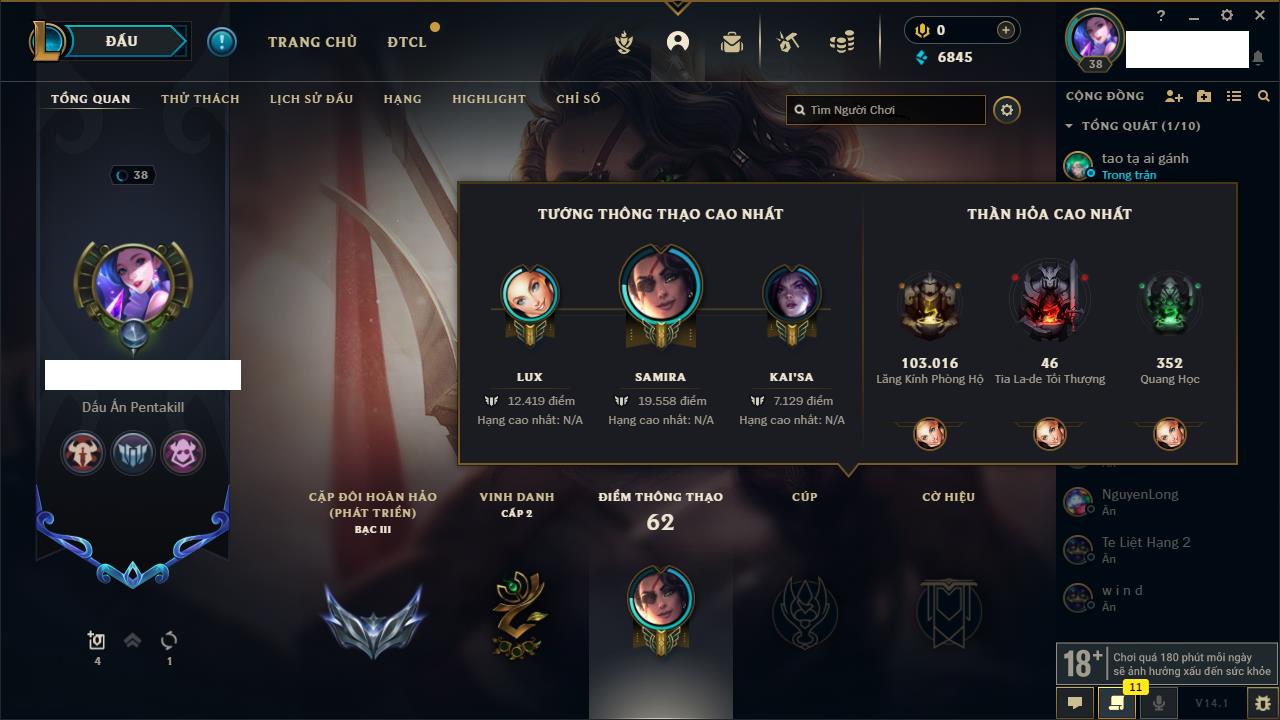 Rank Đơn: Sắt IIIKhung: Chưa có khungTướng: 77 - Còn 8133 THXTrang Phục: 11Rank ĐTCL: Bạch Kim IVLinh Thú: 108