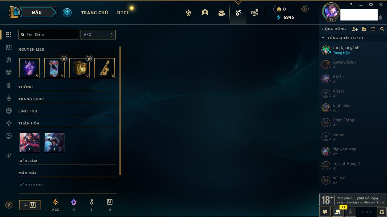 Rank Đơn: Sắt IKhung: SắtTướng: 53 - Còn 21317 THXTrang Phục: 9Rank ĐTCL: Sắt ILinh Thú: 82