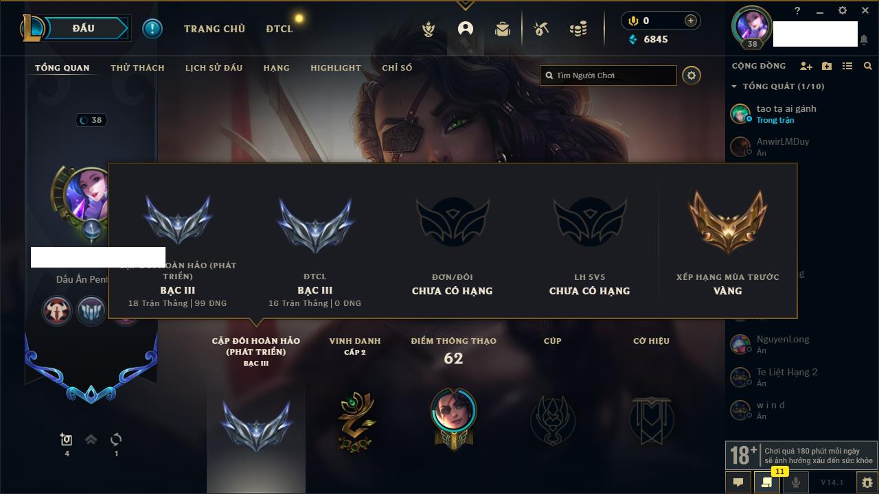 Rank Đơn: Vàng IIIKhung: VàngTướng: 77 - Còn 21172 THXTrang Phục: 8Rank ĐTCL: Kim Cương IIILinh Thú: 23