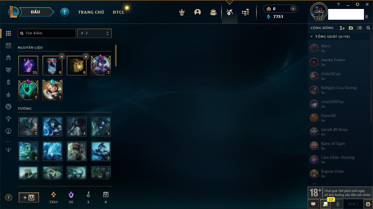 Rank Đơn: Chưa RankKhung: Chưa có khungTướng: 161 - Còn 866 THXTrang Phục: 62Rank ĐTCL: Chưa RankLinh Thú: 28