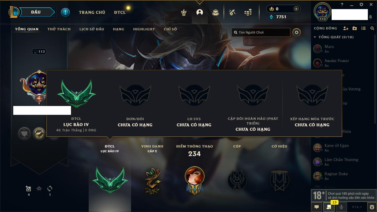 Rank Đơn: Vàng IIIKhung: VàngTướng: 77 - Còn 21172 THXTrang Phục: 8Rank ĐTCL: Kim Cương IIILinh Thú: 23