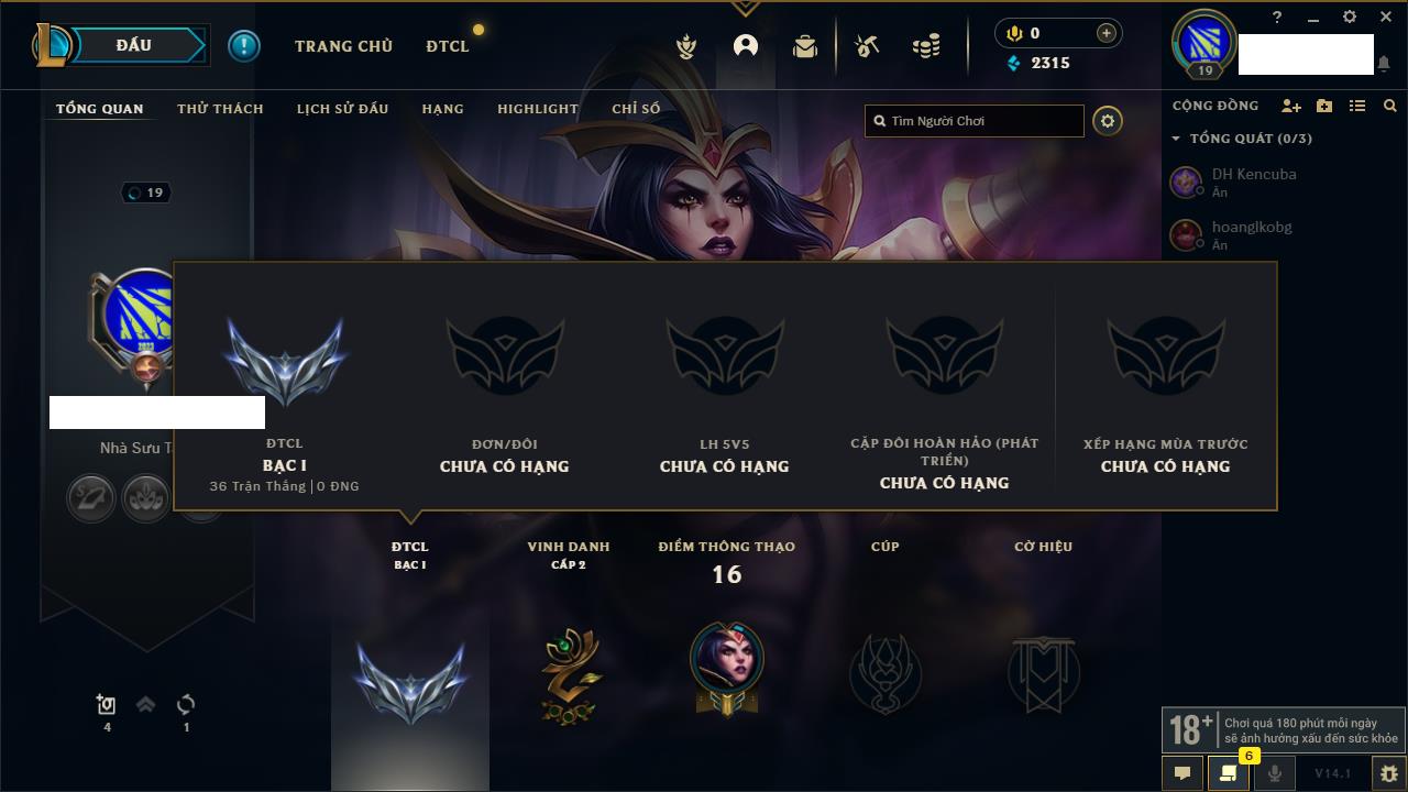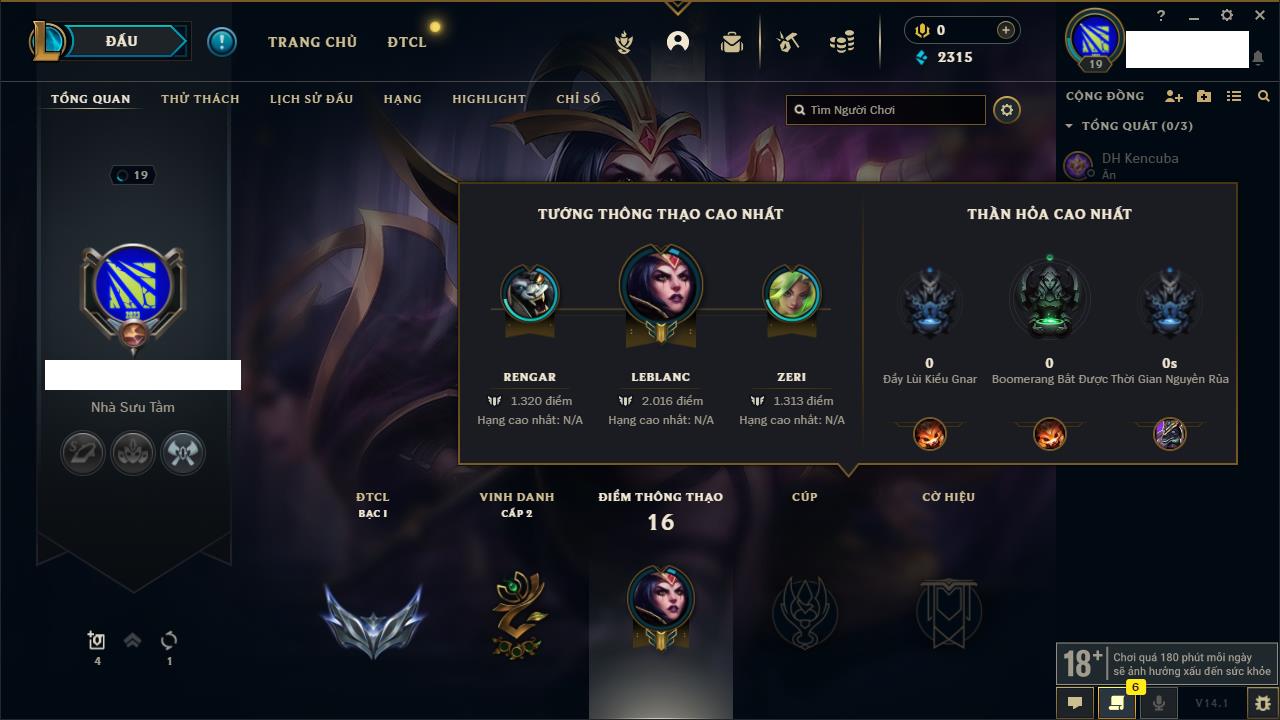 Rank Đơn: Chưa rank mùa nàoKhung: Chưa có khungTướng: 38 - Còn 6280 THXTrang Phục: 2Rank ĐTCL: Chưa RankLinh Thú: 50