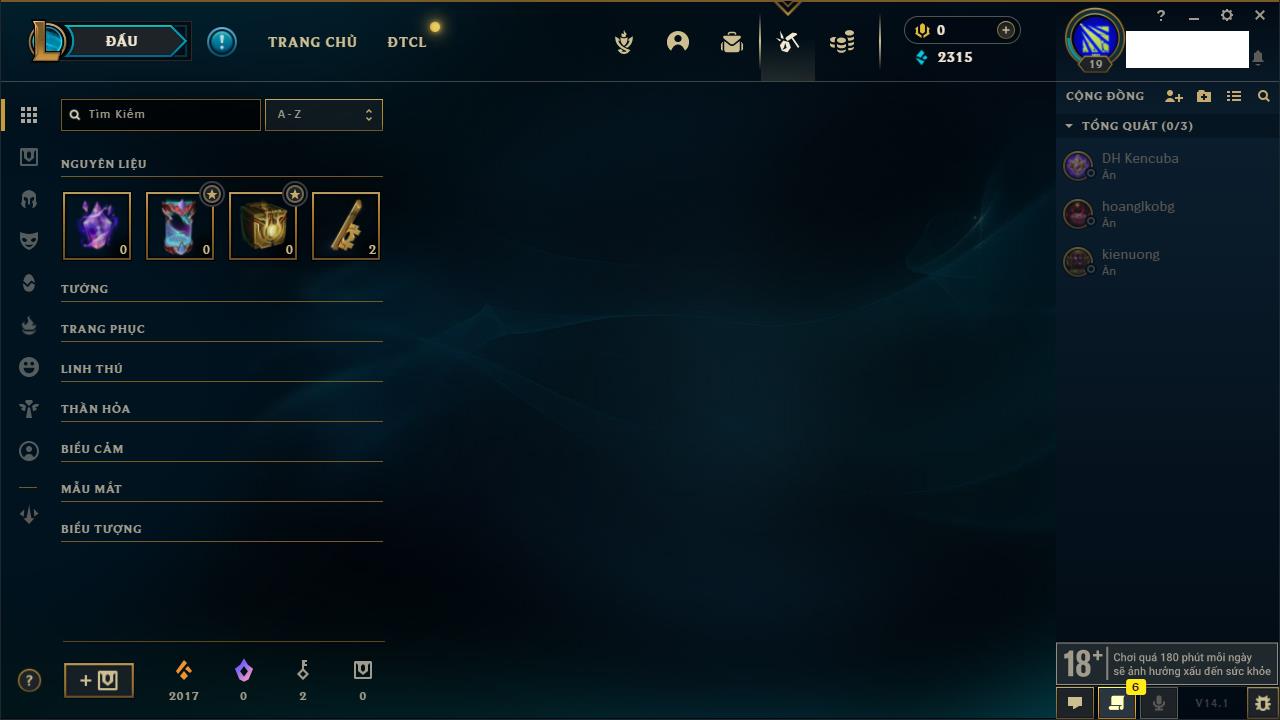 Rank Đơn: Chưa rank mùa nàoKhung: Chưa có khungTướng: 147 - Còn 13200 THXTrang Phục: 0Rank ĐTCL: Chưa RankLinh Thú: 2