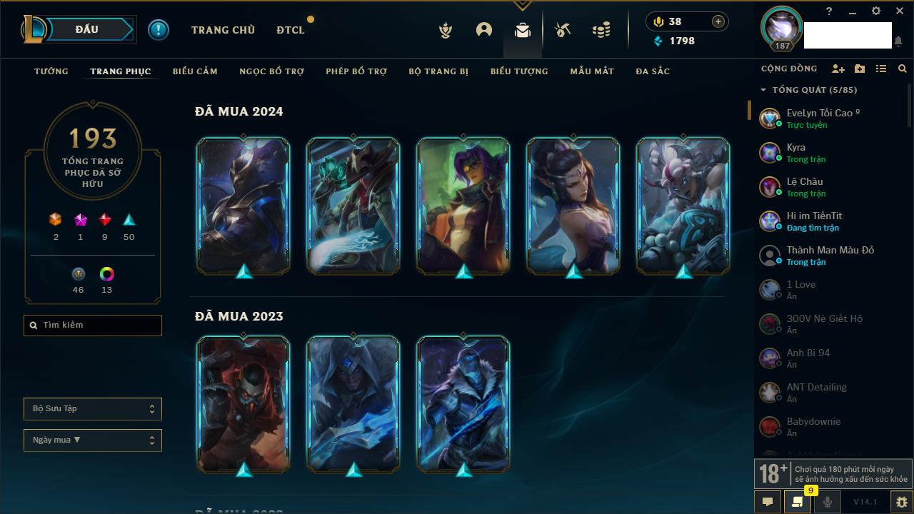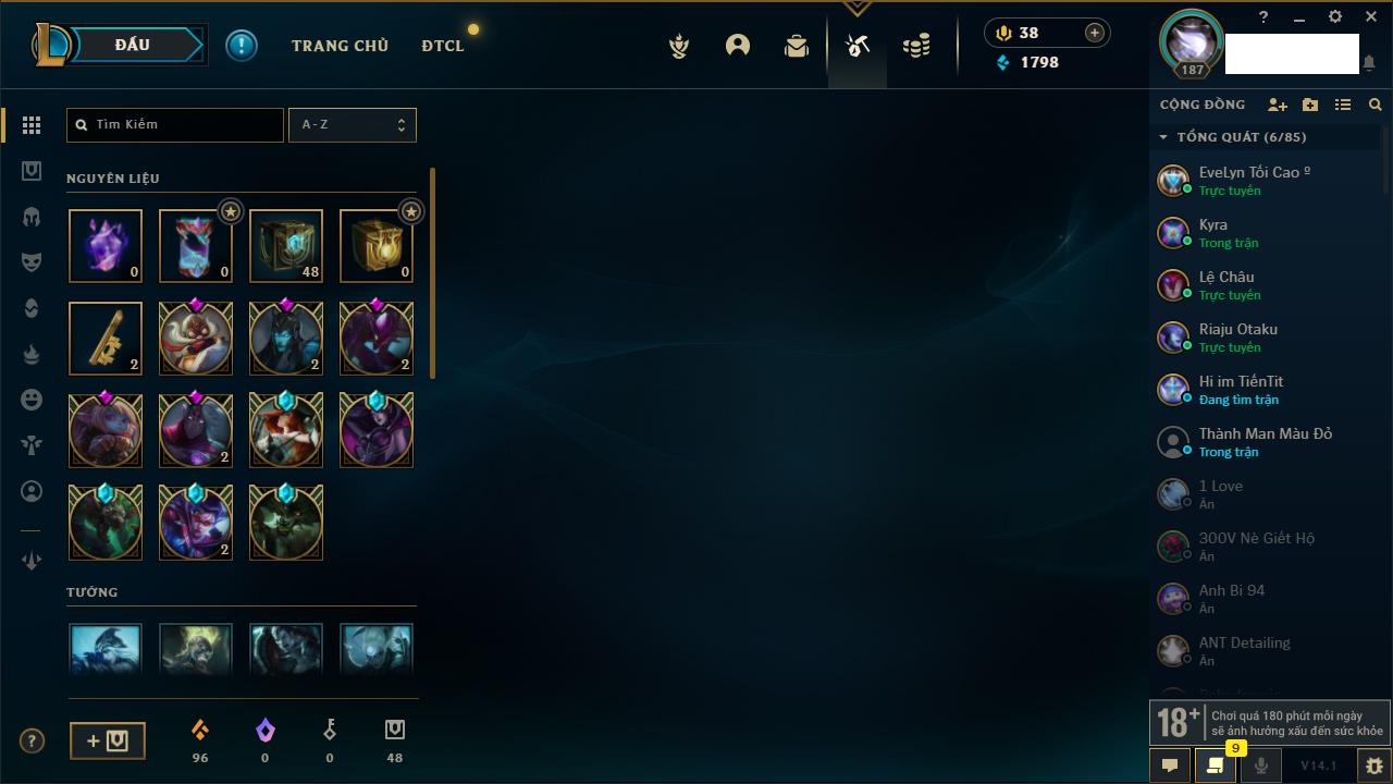 Rank Đơn: Vàng IVKhung: VàngTướng: 171 - Còn 48721 THXTrang Phục: 171Rank ĐTCL: Chưa RankLinh Thú: 27