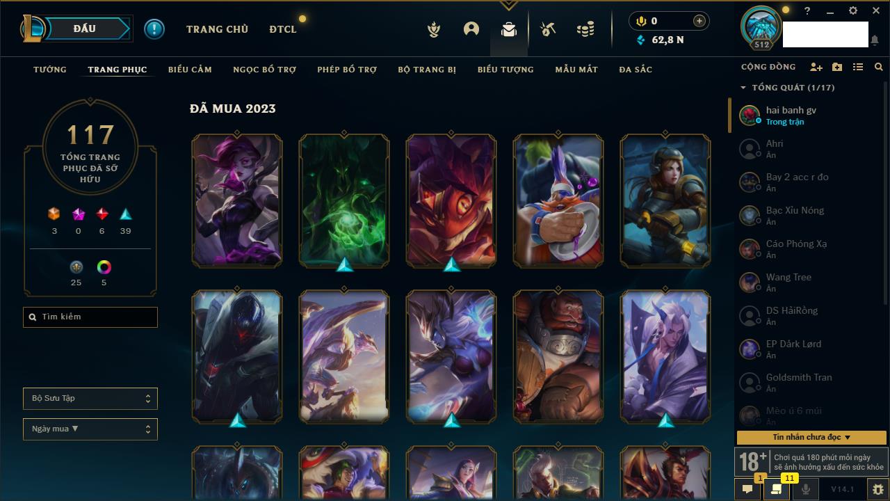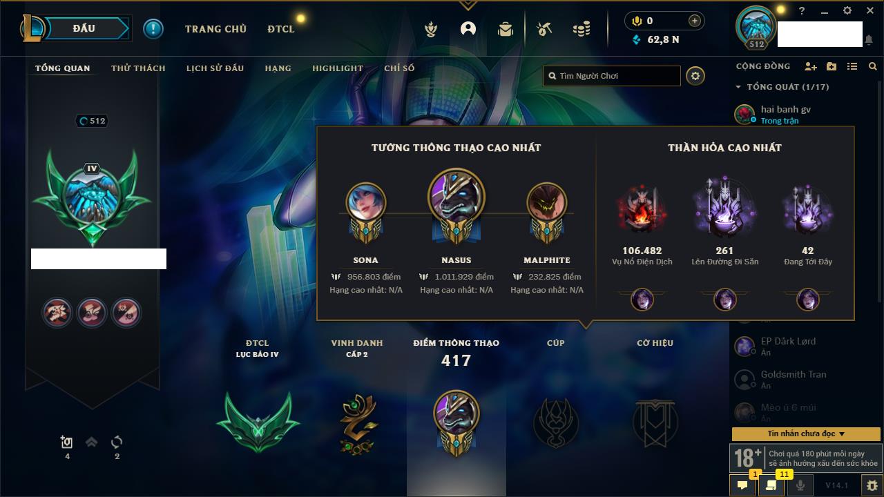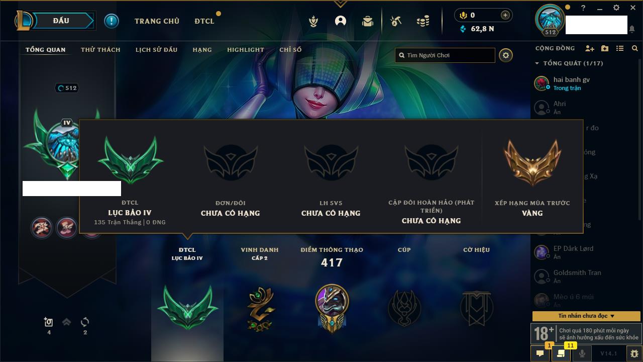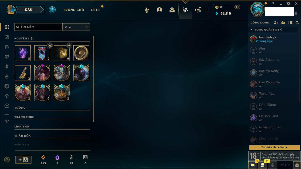Rank Đơn: Bạch Kim IVKhung: Bạch kimTướng: 171 - Còn 218930 THXTrang Phục: 162Rank ĐTCL: Chưa RankLinh Thú: 118