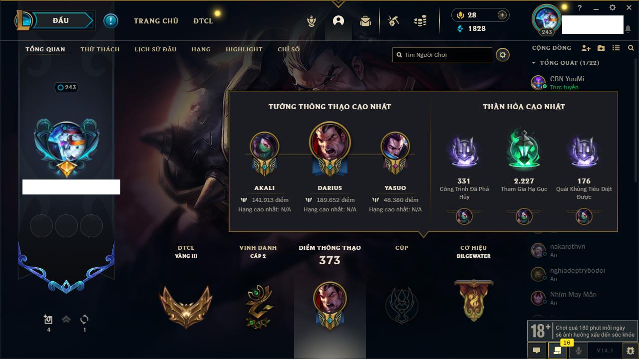 Rank Đơn: Chưa RankKhung: Chưa có khungTướng: 163 - Còn 37947 THXTrang Phục: 101Rank ĐTCL: Chưa RankLinh Thú: 83