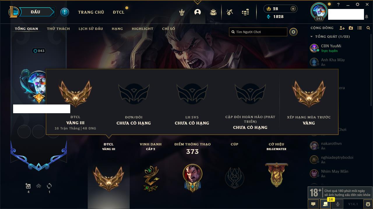 Rank Đơn: Chưa RankKhung: SắtTướng: 148 - Còn 2999 THXTrang Phục: 139Rank ĐTCL: Chưa RankLinh Thú: 43