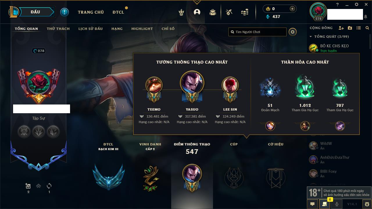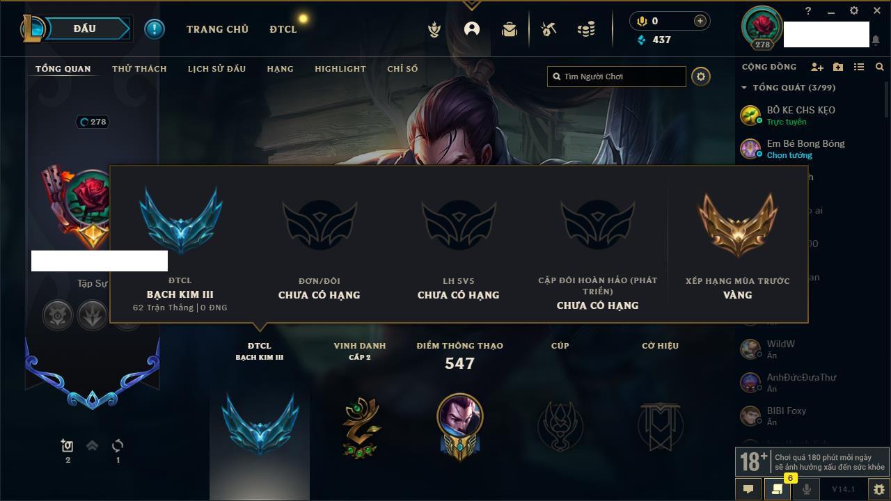 Rank Đơn: Chưa RankKhung: Chưa có khungTướng: 65 - Còn 2075 THXTrang Phục: 10Rank ĐTCL: Chưa RankLinh Thú: 72