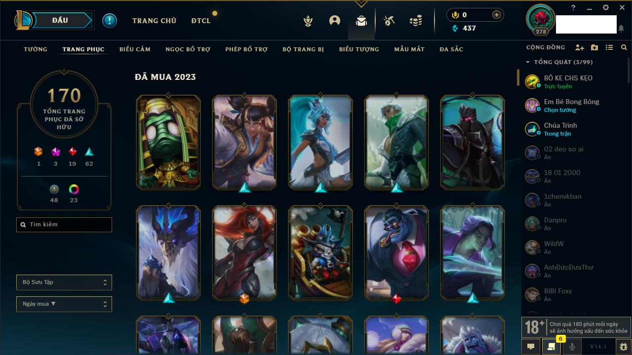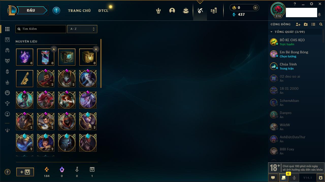 Rank Đơn: Chưa RankKhung: Chưa có khungTướng: 170 - Còn 13795 THXTrang Phục: 75Rank ĐTCL: Chưa RankLinh Thú: 176