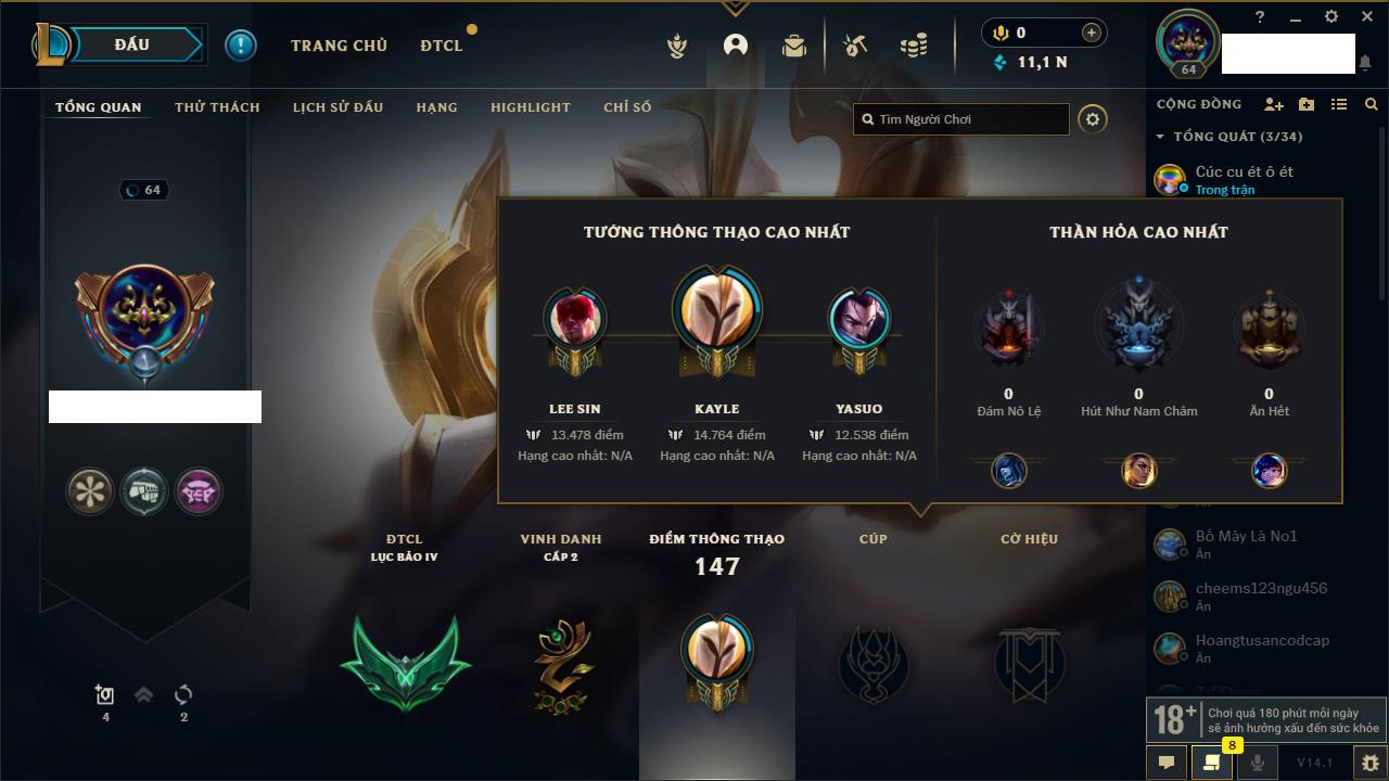 Rank Đơn: Bạch Kim IVKhung: Bạch kimTướng: 171 - Còn 154285 THXTrang Phục: 169Rank ĐTCL: Bạch Kim IILinh Thú: 60