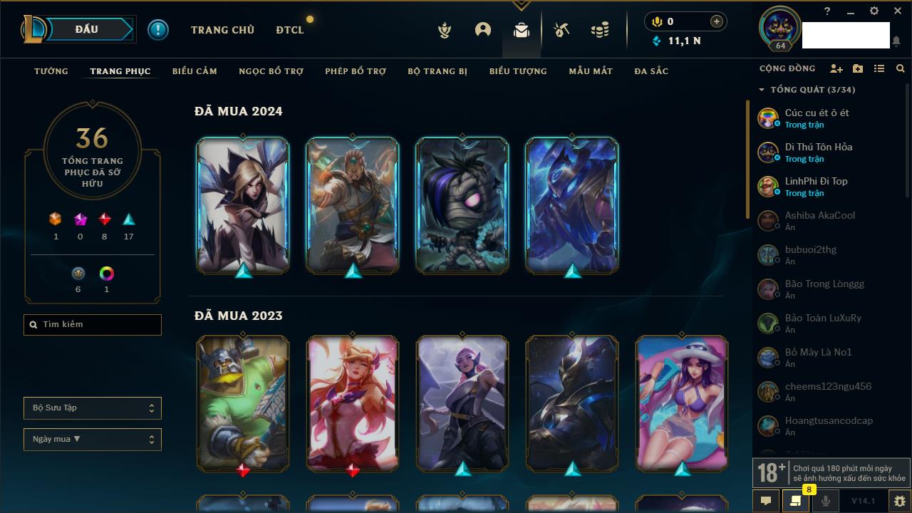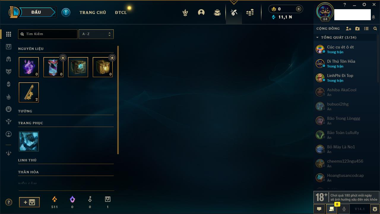 Rank Đơn: Vàng IVKhung: VàngTướng: 171 - Còn 48721 THXTrang Phục: 171Rank ĐTCL: Chưa RankLinh Thú: 27