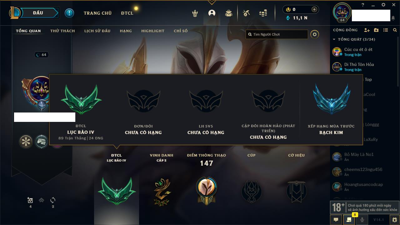 Rank Đơn: Vàng IVKhung: VàngTướng: 171 - Còn 31667 THXTrang Phục: 105Rank ĐTCL: Bạch Kim IIILinh Thú: 89