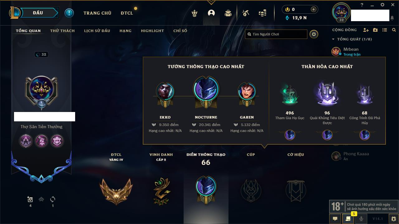 Rank Đơn: Chưa rank mùa nàoKhung: Chưa có khungTướng: 2 - Còn 14900 THXTrang Phục: 0Rank ĐTCL: Bạch Kim IIILinh Thú: 29
